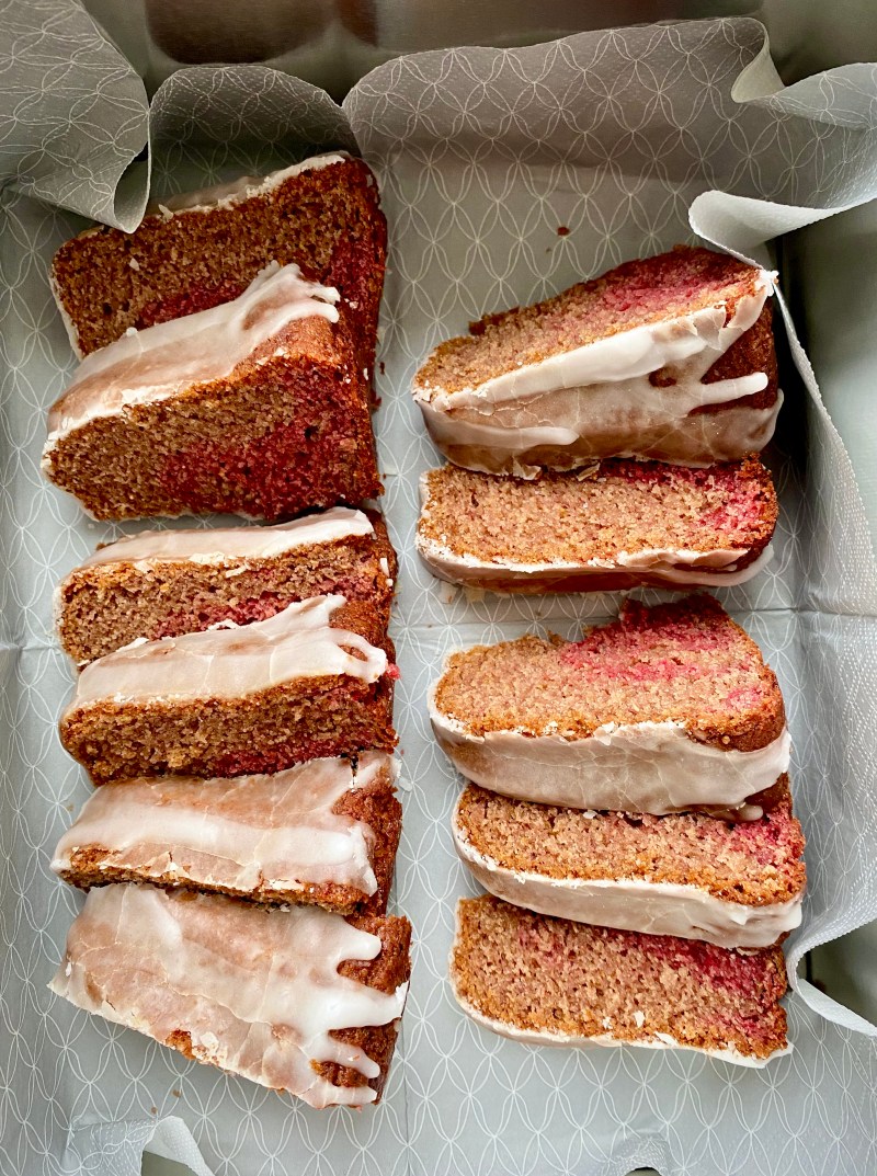Klassiker mal anders: pinkfarben marmorierter Rührkuchen mit getrockneten Beeren und süßem Zuckerguss.