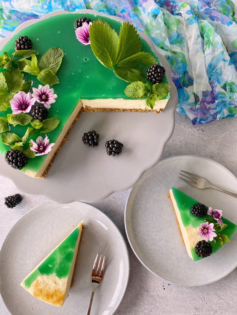 Cremiger Cheesecake mit Kekskrümelboden, erfrischender Ananas-Quarkschicht und einem fruchtigen Spiegel aus Ananassaft und Blue Curaçao-Sirup.