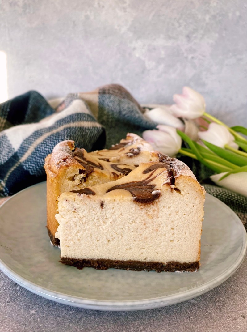 Cremige Käseschicht eingebettet zwischen Nougatboden und zartschmelzenden Nougat-Swirls.