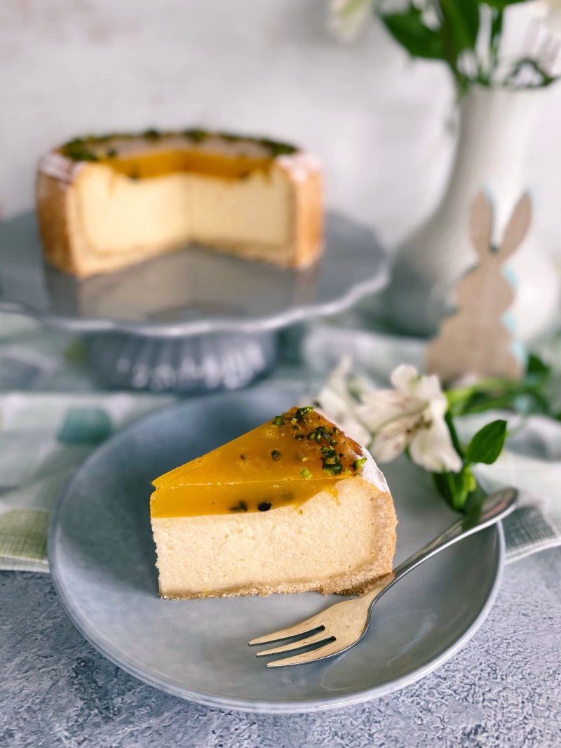 Herrlich cremiger Käsekuchen mit Marzipan und erfrischendem Passionsfruchtspiegel. Mit der Garnitur aus gehackten Pistazien ist er eine tolle Bereicherung für die festliche Ostertafel.
