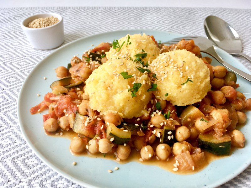 Orientalisch gewürztes Gemüse mit Kichererbsen trifft auf fruchtig-cremige Polenta.