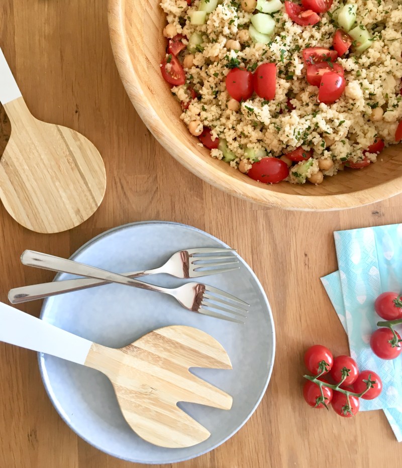 Erfrischender Couscous-Salat mit Kichererbsen, Gurke, Tomate, Petersilie, Minze und einem Tahin-Dressing.