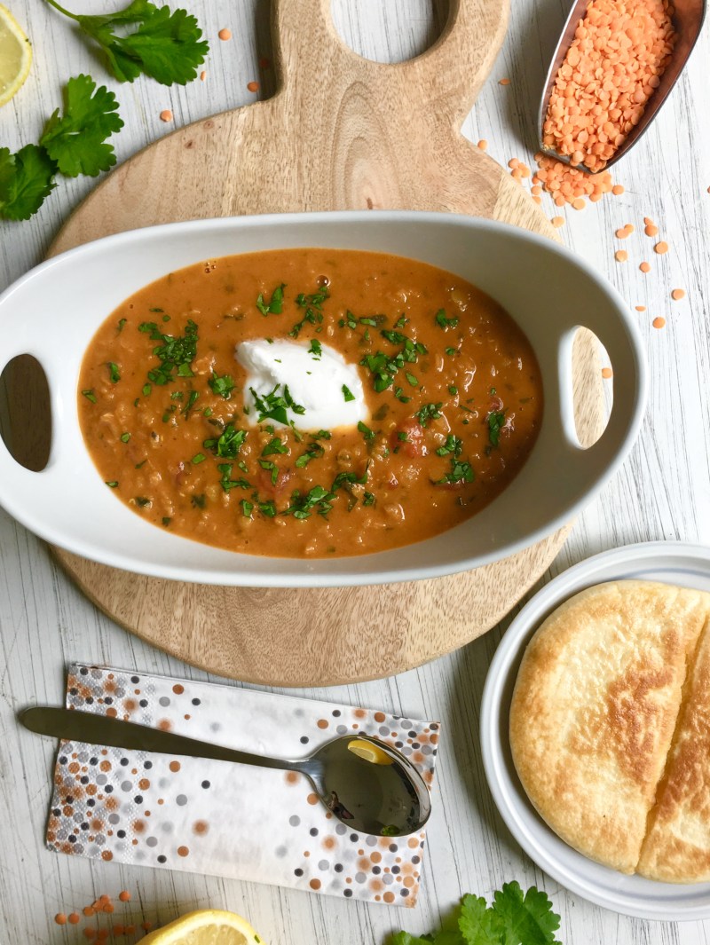 Diese köstliche Linsensuppe mit Ingwer, indischen Gewürzen, Kokosmilch und Koriander ist in Nullkommanix fertig und wird perfekt ergänzt durch Kokosjoghurt und fluffigem Naanbrot für Faule.