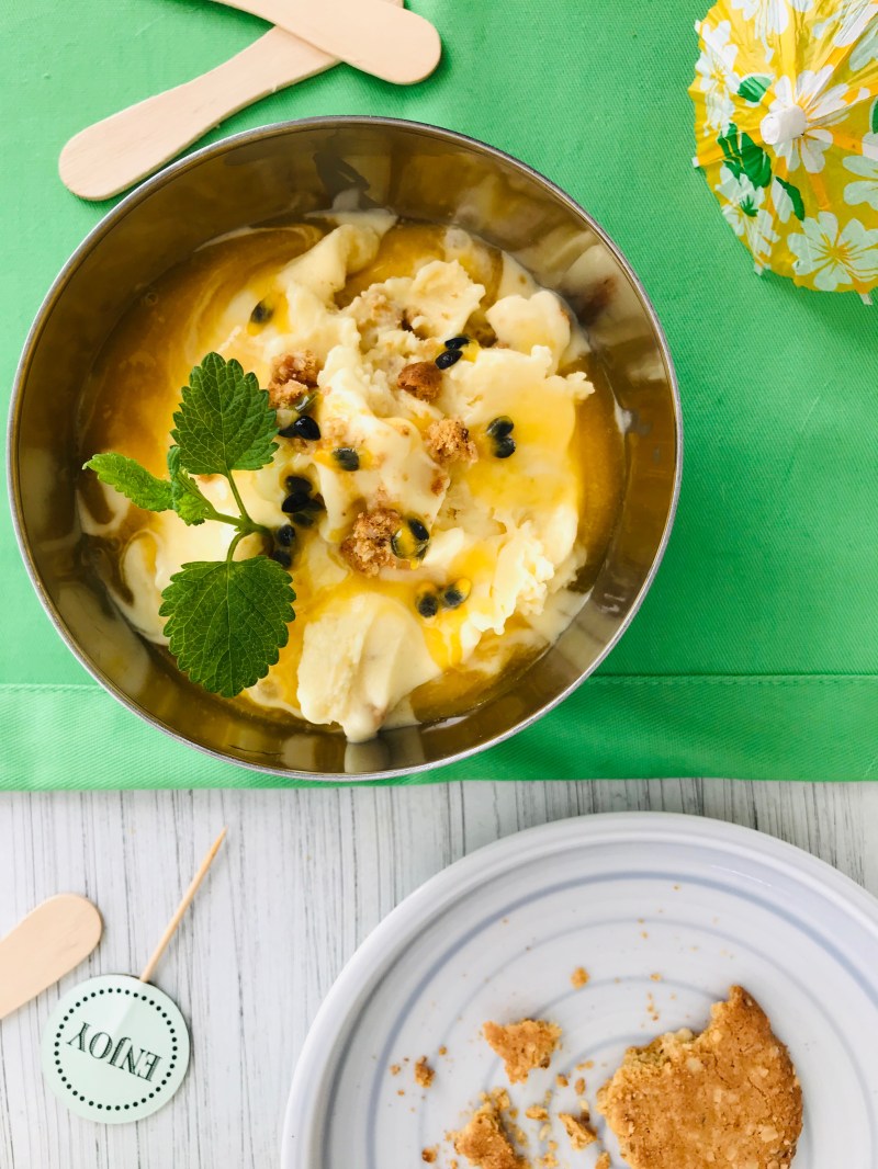 Sommer und Eis passen einfach perfekt zusammen, und dieses vegane Passionfruit Cheesecake-Eis ist die ultimative Sommersorte: cremiges, fruchtig-frisches Cheesecake-Eis durchzogen von Keksstückchen und noch mehr Passionsfrucht in Form eines leuchtend orangefarbenen Swirls.