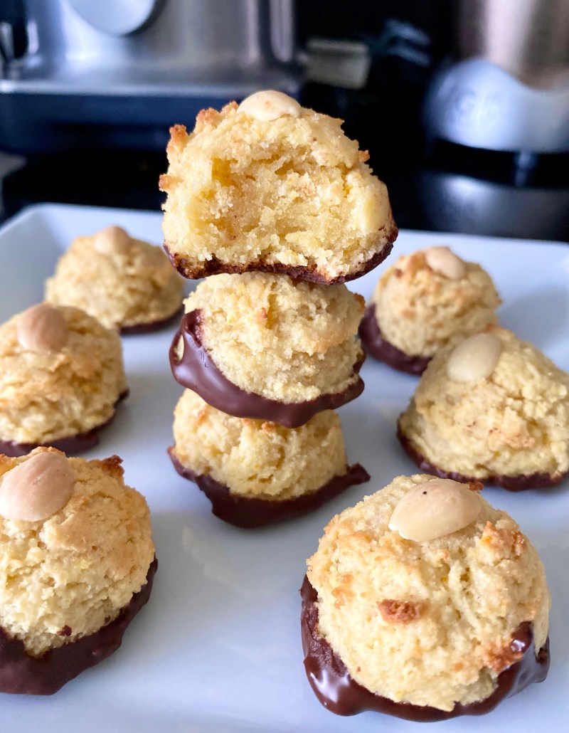 Weicher fruchtiger Marzipankern mit knuspriger Cookie-Hülle gedippt in dunkle Schokolade.