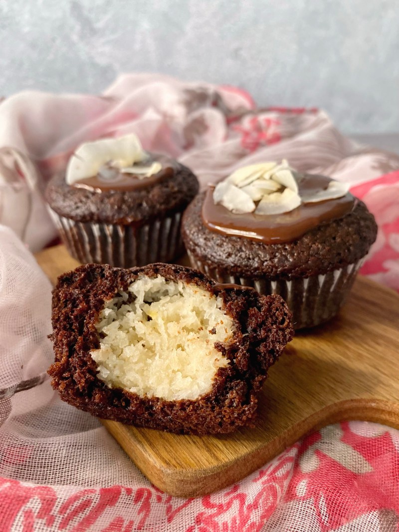 Saftige Double Chocolate Muffins mit Kokoskern und Schoko-Guss.