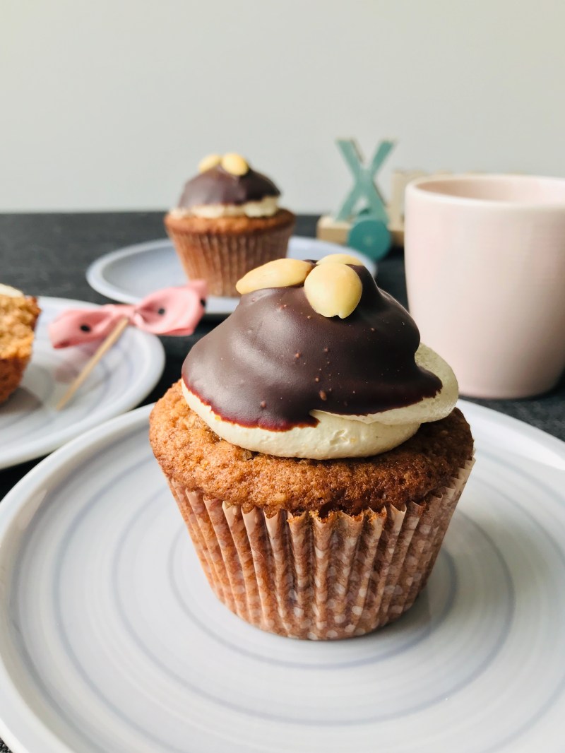 Weihnachtlich gewürzte Haselnuss-Cupcakes mit Stückchen von Orangeat, Zitronat und Marzipan, dazu ein cremiges Marzipantopping, Schokoladenganache und geröstete Mandeln.